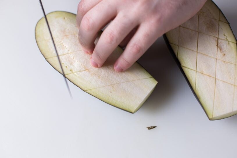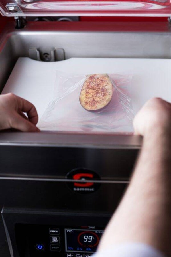 En esta receta, la técnica de la cocción al vacío nos ayuda a obtener una cocción de la berenjena menos agresiva y a poder tener el producto pasteurizado y envasado en raciones. También nos ayuda a potenciar los sabores y olores de la elaboración.